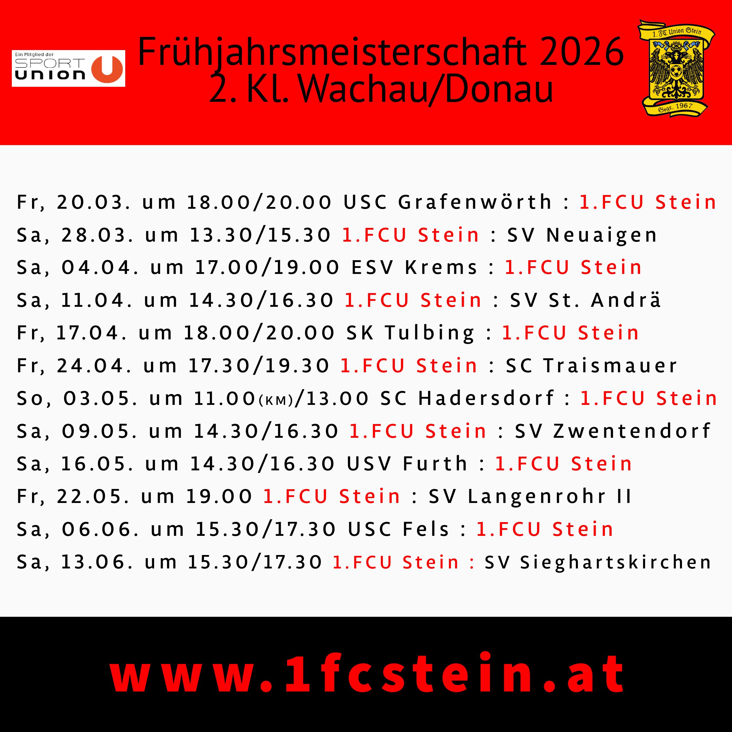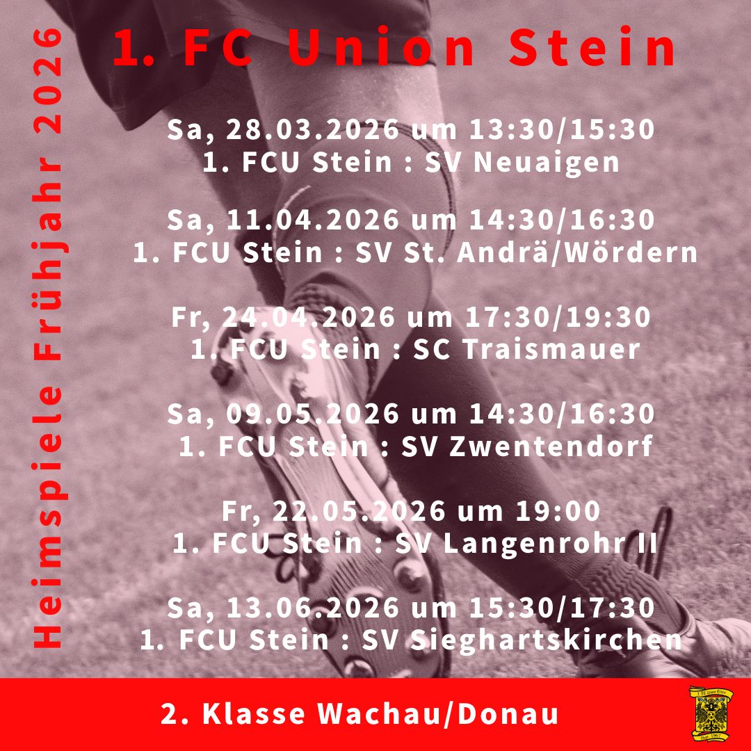 Unsere Heimspiele in Stein im Frühjahr 2026 auf einen Blick! Wir freuen uns auf euren Besuch am Steiner Sportplatz!